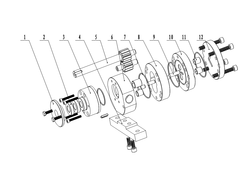 1、壓蓋 2、填料密封 3、密封腔 4、支座 5、齒輪副 6、前支架 7、密封圈 8、泵體 9、定位銷 10、后支架 11、軸承 12、后蓋