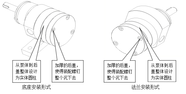 無(wú)論是法蘭安裝形式還是底座安裝形式,從泵體到后蓋整體設(shè)計(jì)為實(shí)體圓柱,方便用戶纏繞加溫帶或加熱管;厚實(shí)的后蓋,讓裝配螺釘沉下去,形成整齊的平面,即保證了在較高的溫度下,泵的零部件不會(huì)因發(fā)生變形卡死,又方便了加熱套的裝配。